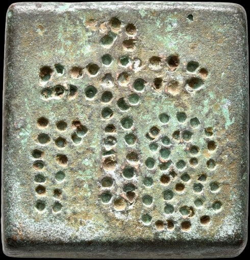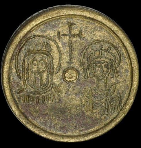 - Poids byzantin de 2 onces (12 solidi), fin Ve–VIe s., orichalque, 28 × 28 mm, 53 g. Deux empereurs nimbés en armes, croix centrale, lettres Γ–B ; incrustations d’argent et de cuivre, revers uni. Leu Numismatik, Auction 2, Lot 347
