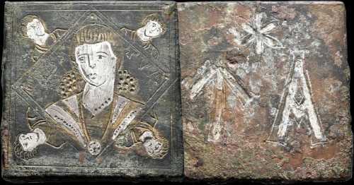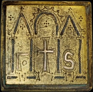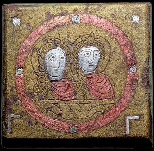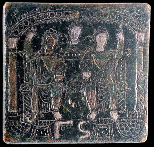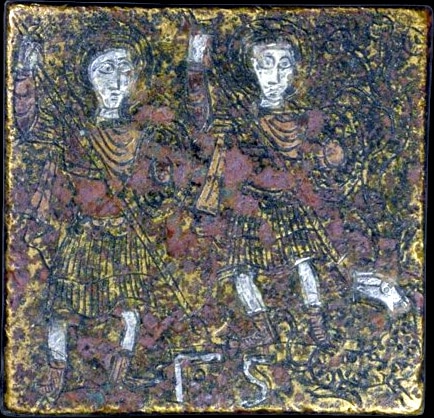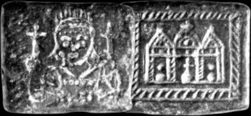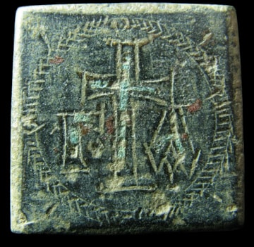 - Alliage cuivreux et argent, 4,5×4,5 cm, masse inconnue. Source. Ministère grec de la Culture et des Sports, Musée byzantin et chrétien d’Athènes, inventaire no BXM 834.