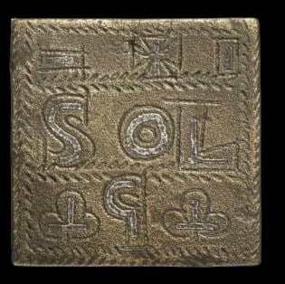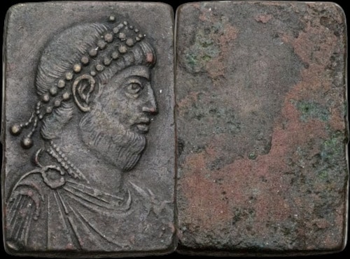 - Julien II dit le Philosophe (360-363). Poids officiel de solidus (exagium), bronze rectangulaire (15 × 21 mm, 4,34 g), Heritage Auctions, Auction 3037, Lot 30159
